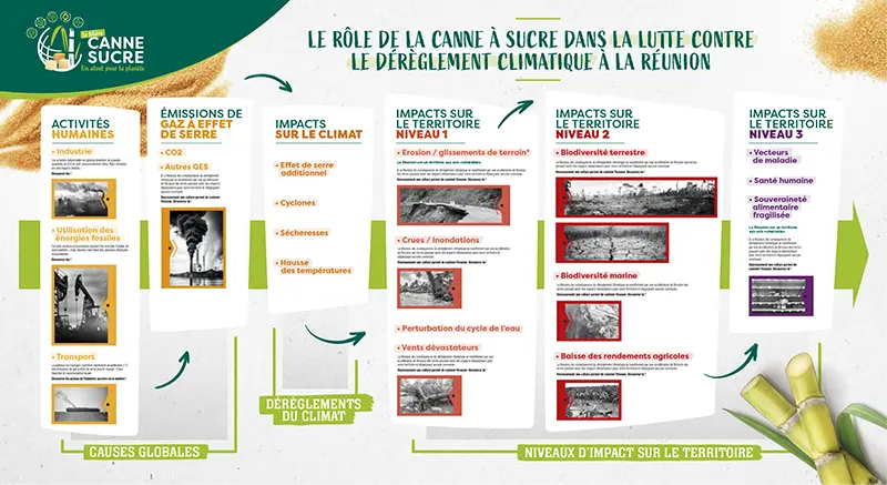 La déclinaison de la fresque du climat interactive aide à comprendre les impacts positifs de la canne dans la lutte contre les dérèglements climatiques, en valorisant son mode de culture agroécologique et son modèle d’économie circulaire.