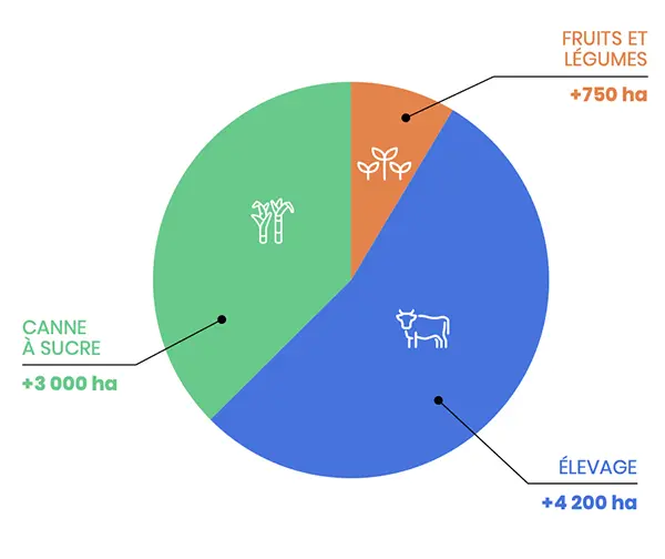 Ainsi la SAU augmenterait pour le développement des filières d’élevage et fruits et légumes de 5 000 ha à horizon 20301 et de 3000 ha pour la canne à sucre.
