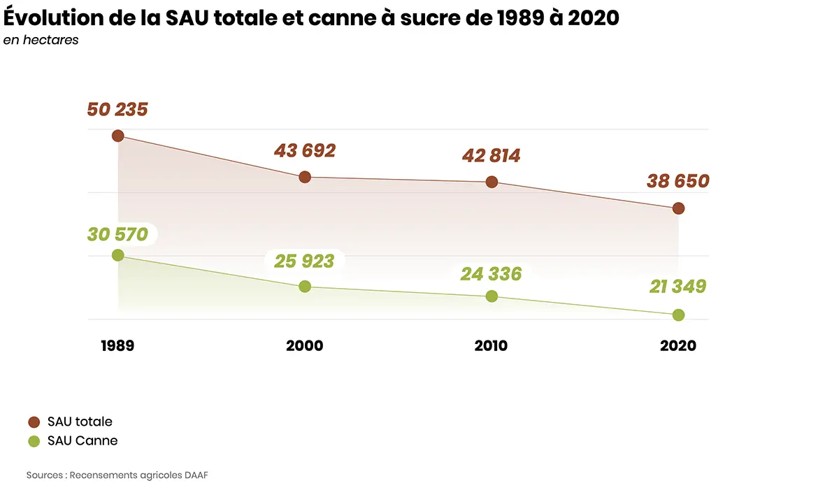 La SAU réunionnaise tend à diminuer au cours du temps : de 50 000 ha en 1989, l’île ne présente plus aujourd’hui qu’une SAU d’environ 37 500 ha.