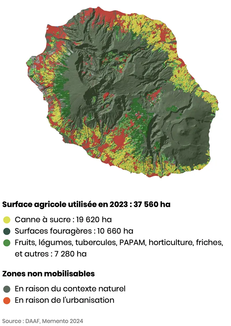 Le foncier constitue le socle de l’agriculture : la préservation des terres agricoles réunionnaises, soumises à de multiples contraintes, est donc un enjeu majeur pour garantir l’équilibre du modèle agricole de l’île, qui s’appuie sur une sole cannière occupant environ 55% de la surface agricole utile (SAU) totale.